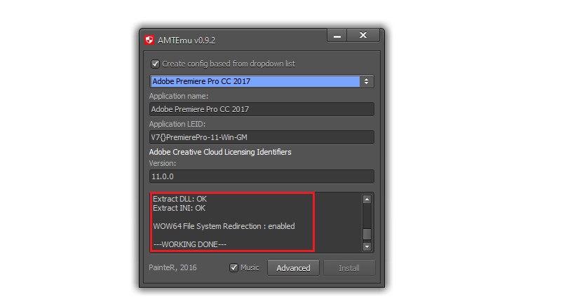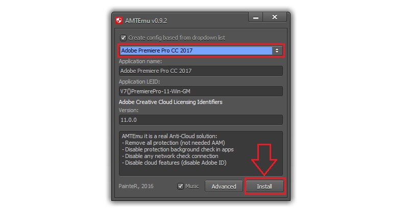Bước 1: Bạn tải file crack mình để link riêng bên trên, sau đó mở file amtemu.v0.9.2.exe lên. Bạn cần phải tìm đến phiên bản Adobe Premiere CC 2017 như trong hình, sau đó bạn click vào Install