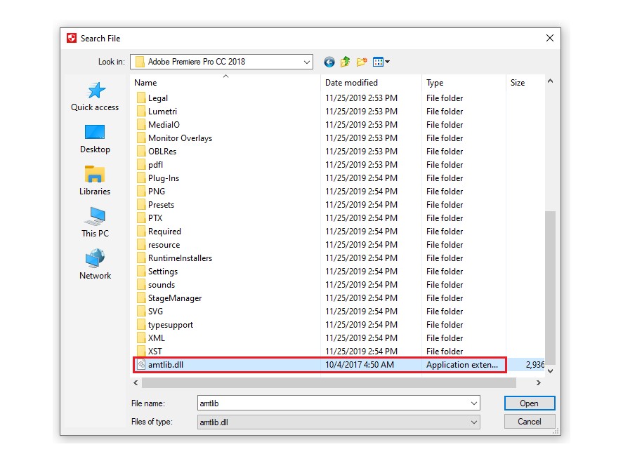 Bước 2: Tiếp theo, bạn cần phải tìm đến thư mục cài đặt Adobe Premiere CC 2018 theo đường link: C:\Program Files\Adobe\Adobe After Effects CC 2018 để nó tiến hành chèn file amtlib.dll Sau đó bấm Open