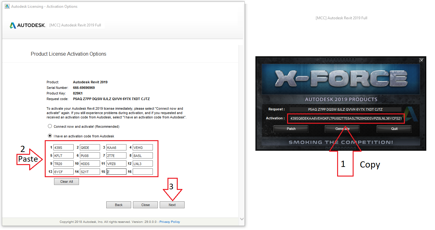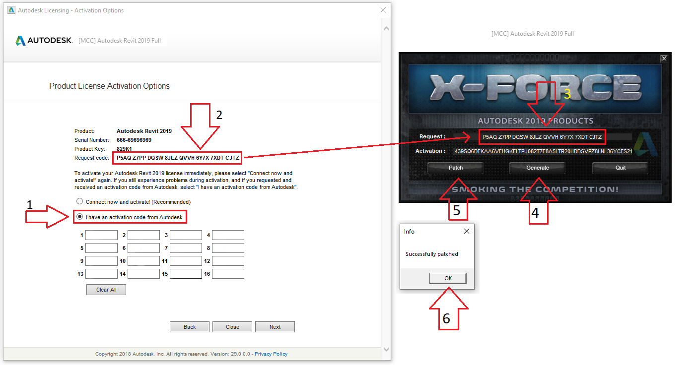 Bước 8: Chọn “I have an activation code from Autodesk“. Copy Request code và paste vào Request của phần mềm crack như hình. Chọn Generate tiếp theo chọn Patch. Hiện thông báo Successfully patched như hình là được.