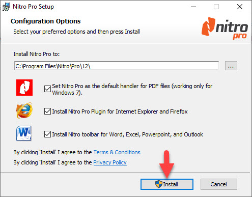 – Bước 1: Giải nén và chạy file nitro_pro12_x***.msi. Tại cũng ô trống, bạn có thể tích tất cả hoặc bỏ chọn một số ô nếu bạn cảm thấy không cần thiết. Sau đó chọn Install để tiến hành cài đặt như hình minh họa: