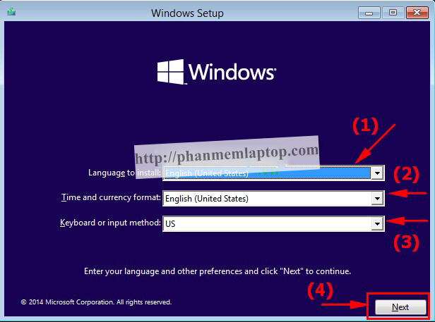 Bước 2: Chọn ngôn ngữ và định dạng bàn phím nhập vào, nhấn Next để tiếp tục
