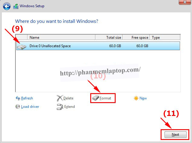 Bước 6:Lựa chọn phân vùng cài hệ điều hành, Format hệ điều hành cũ ...
