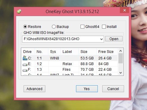 Sau đấy khởi động OneKey Ghost, ứng dụng sẽ quét máy tính và nạp vào những bản ghost nó tìm thấy, bạn chọn bản ghost mong muốn bung > tích vào Restore sau đó lựa chọn File Ghost đã lưu trong máy tính và lựa chọn phân vùng cần khôi phục lại sau đó bạn Click Yes.