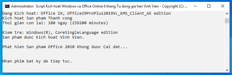 Bước 6: Quá trình kích hoạt sẽ diễn ra trong vài giây tiếp theo. Nếu bạn thấy thông báo hiện lên như dưới hình tức là đã kính hoạt bản quyền thành công, lúc này bạn có thể ấn phím bất kì để thoát khỏi màn hình này.