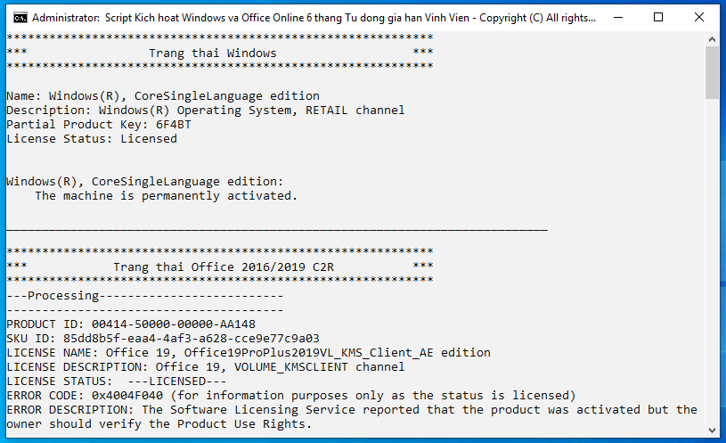 Nếu kết quả có chữ “licensed” hoặc “activated” thì tức là bạn đã kích hoạt thành công.