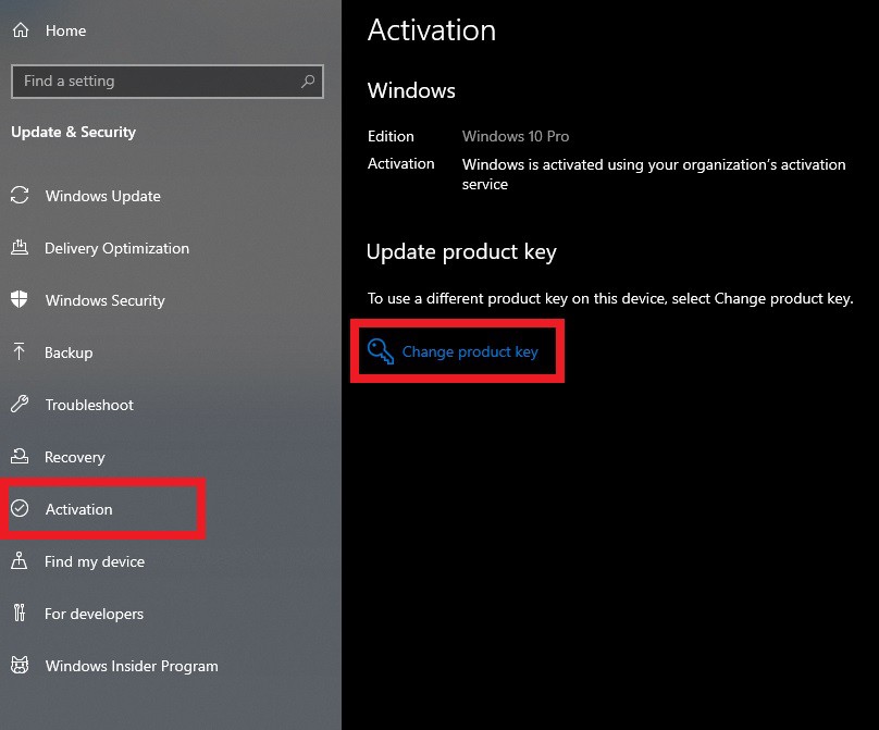 Bước 2: Trong danh sách bên trái, click vào mục Activation. Tiếp đó trong phần màn hình bên phải, click vào dòng Change product key